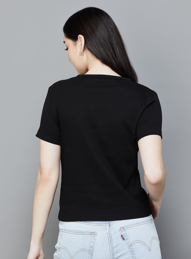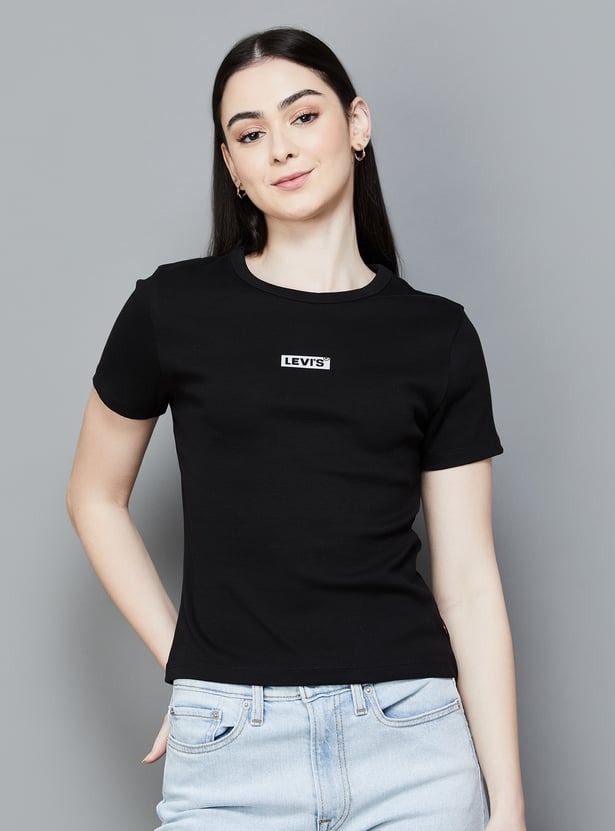 Update your style with this T-shirt. It has a round neck and half sleeves. The brand print adds a signature look.
